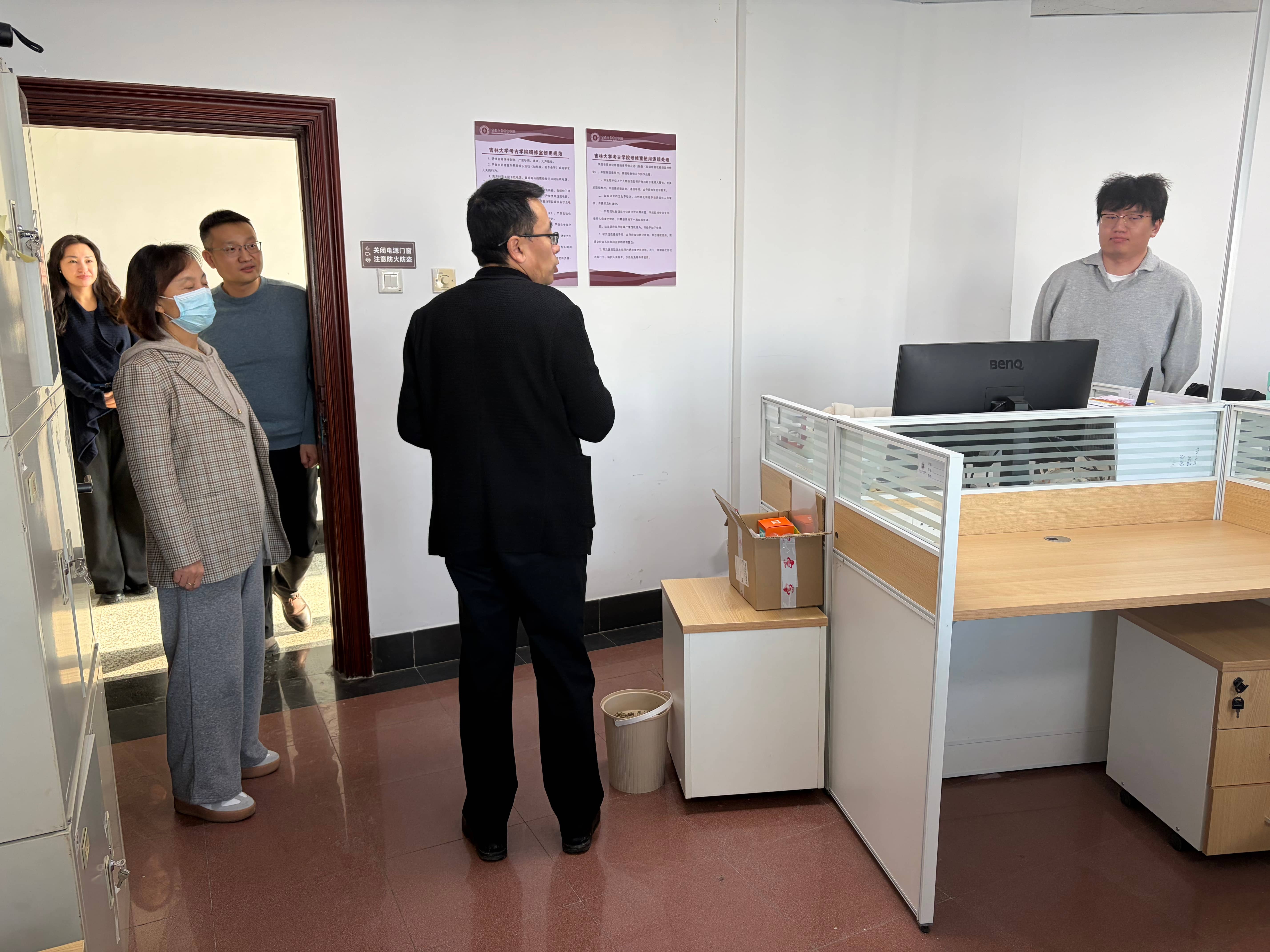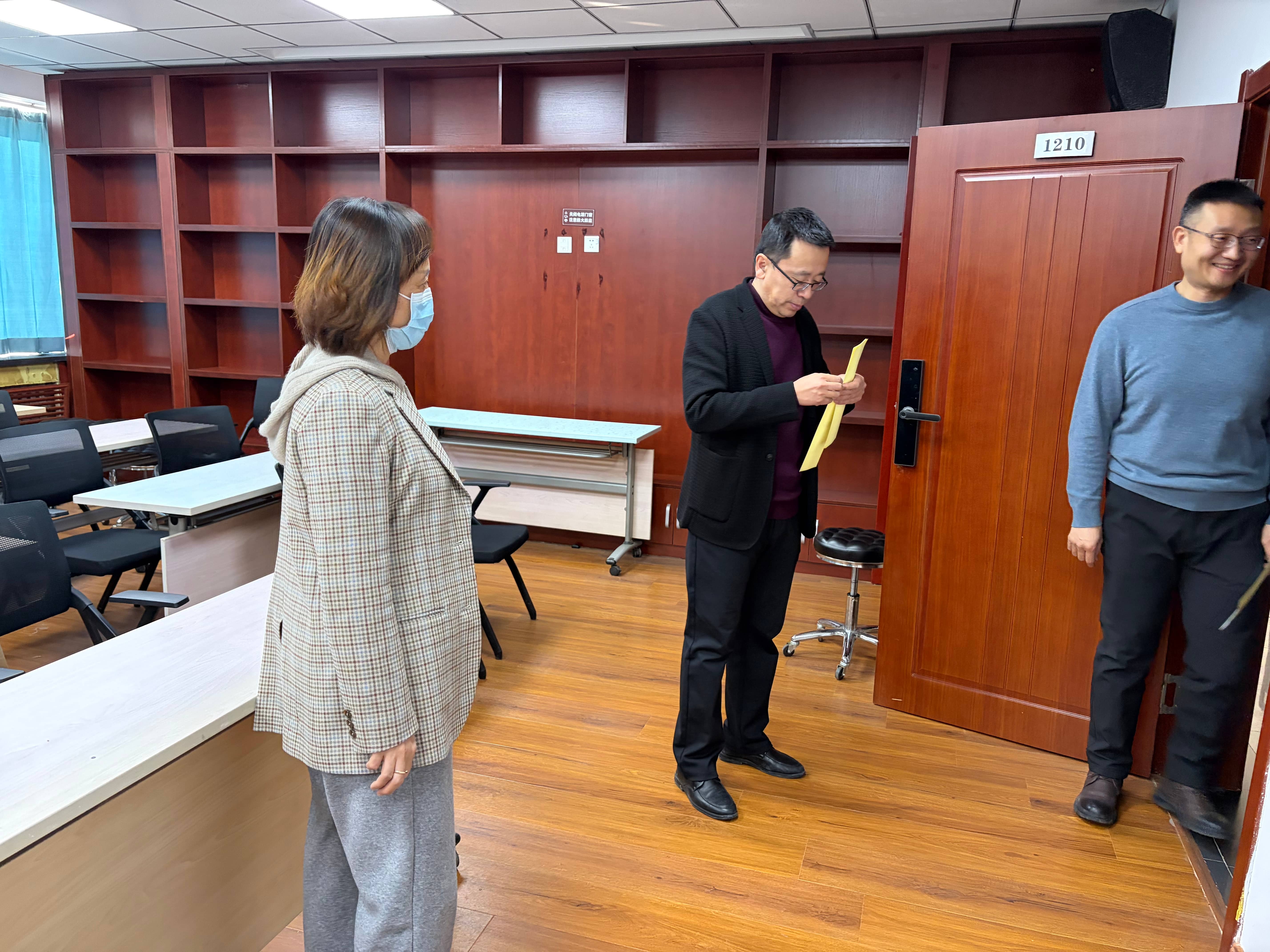 检查人员一行聚焦校园消防安全、建筑场所安全、实验室安全等重点领域和关键环节,对照相关领域规范标准,对所辖区域开展自查自纠,重点检查消防安全,尤其是有无违规用电、占用堵塞疏散通道等情况,着重排查使用插排、充电器、电线收纳不规范等问题,及时发现并清除可能存在的安全隐患。对假期不用的教室、研修室、会议室、实验室等公共房间粘贴封条处理,确保假期楼宇安全。