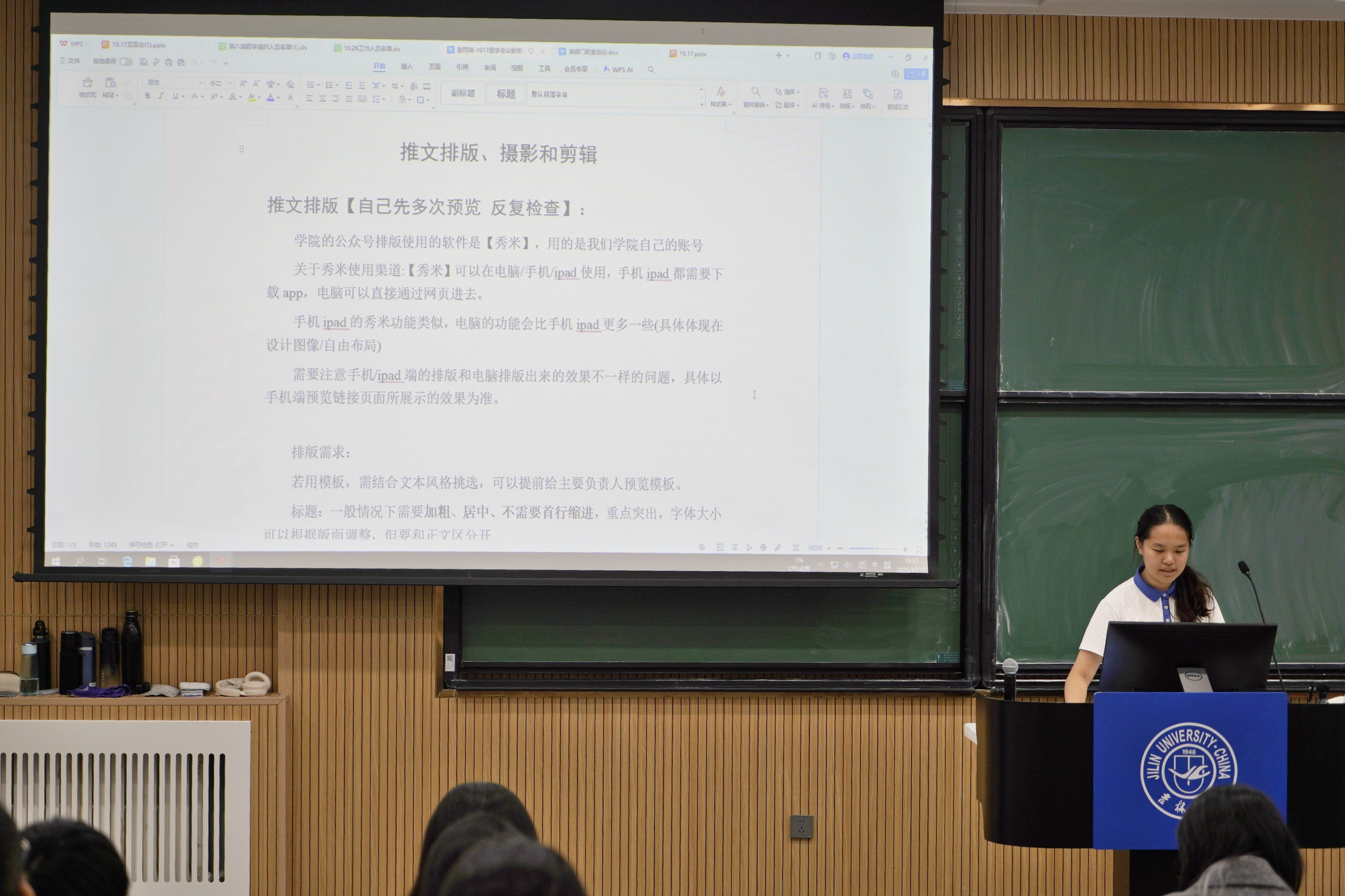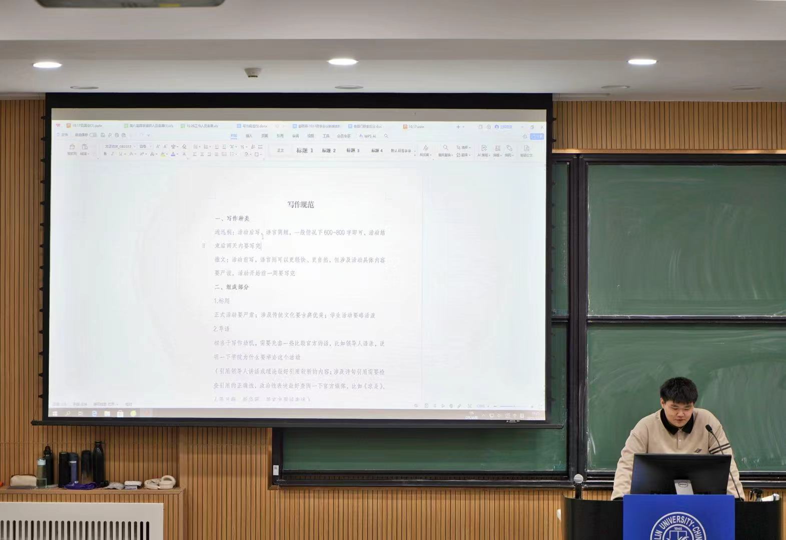 接下来,宣传部主要负责人邹兴展从写作种类、组成部分、格式、注意事项四点出发,为在场同学培训通讯写作方法。宣传部主要负责人彭雨菲对摄影、剪辑、排版等事务提出具体要求,对工作流程、作品审核、专业软件的使用方法和设备管理制度进行了讲解。