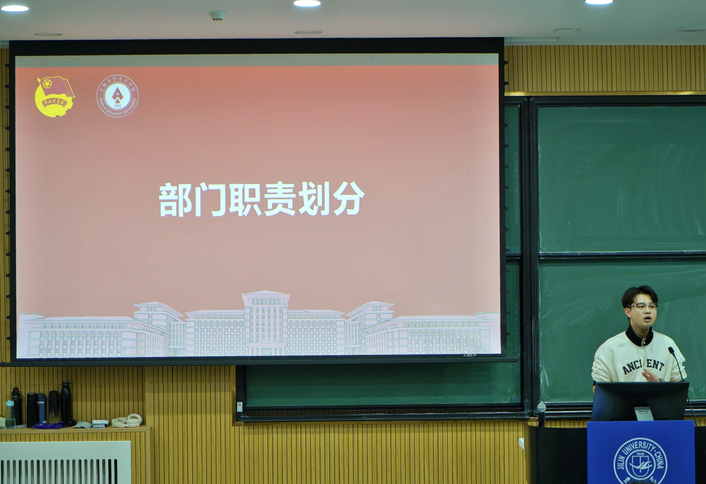 在会议第二部分,李禹恒对各部门的职能进行阐述与说明。王笑扬进一步细化综合事务部与团委办公室的职责,系统梳理了我院财务报销流程细则,并明确仓库管理规范。