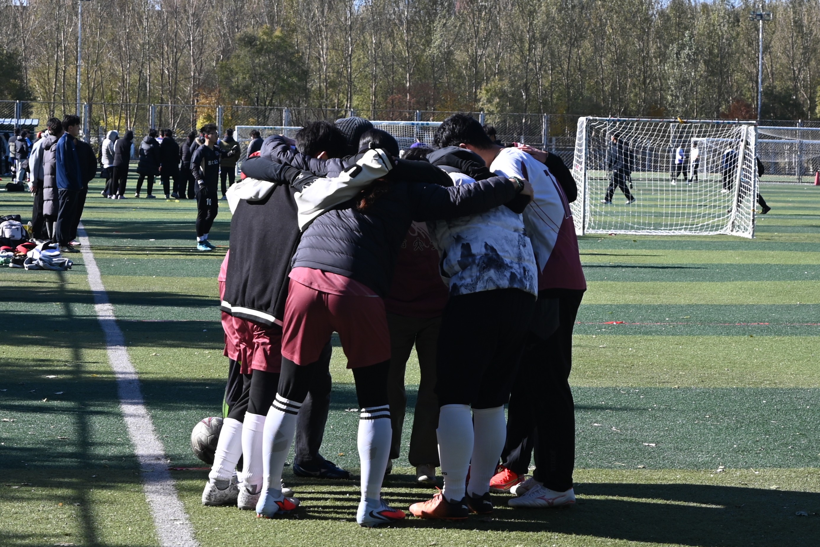 团队赛事,士气尤为关键。队员们整装待发,彼此搭肩围聚,相互激励,士气高昂。