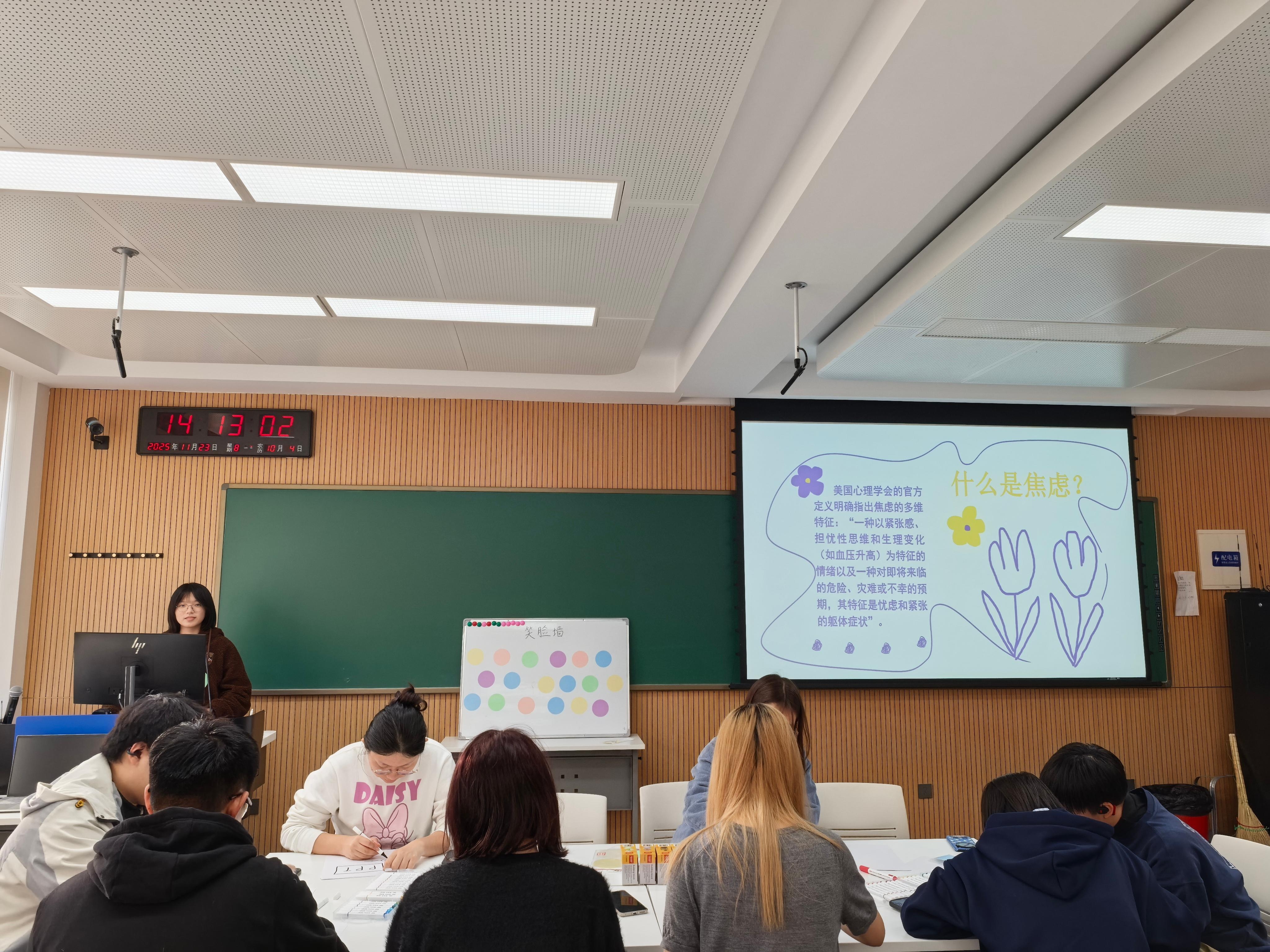 活动伊始,王艺洁同学为大家带来了焦虑知识科普分享。她从焦虑的科学定义切入,结合学生群体常见的学业压力、人际交往等问题,详细讲解了焦虑情绪的具体表现,并用通俗易懂的语言分享了正念呼吸、合理规划时间、积极心理暗示等实用应对方法,为同学们提供了科学缓解焦虑的“工具箱”,帮助大家正确认识焦虑、学会与焦虑共处。